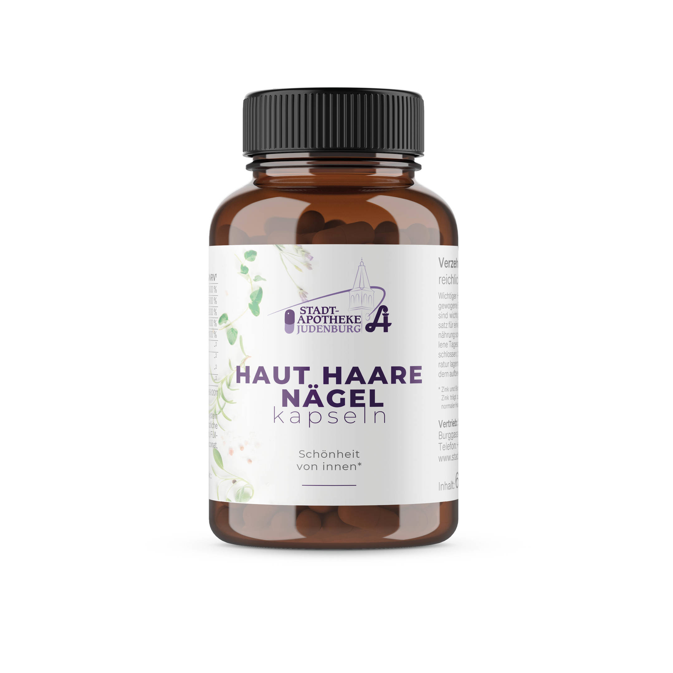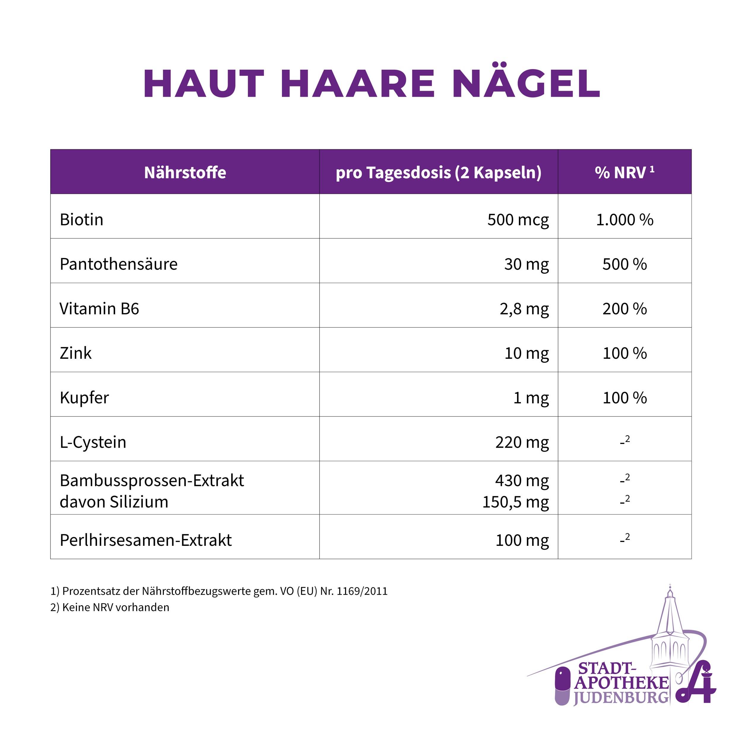 Schönheit kommt von innen und zeigt sich nach außen durch eine strahlende Haut, glänzendes Haar und starke Nägel. Dabei werden Haut, Haare und Nägel tagtäglich durch trockene Luft, Hitze, UV- Strahlung oder eine unausgewogene Ernährung strapaziert. Wertvolle Nährstoffe wie Biotin, Pantothensäure, L-Cystein, Kupfer, Zink, Vitamin B6, Bambussprossen-Extrakt und Perhirsesamen-Extrakt unterstützen Haut, Haare und Nägel auf natürliche Weise.