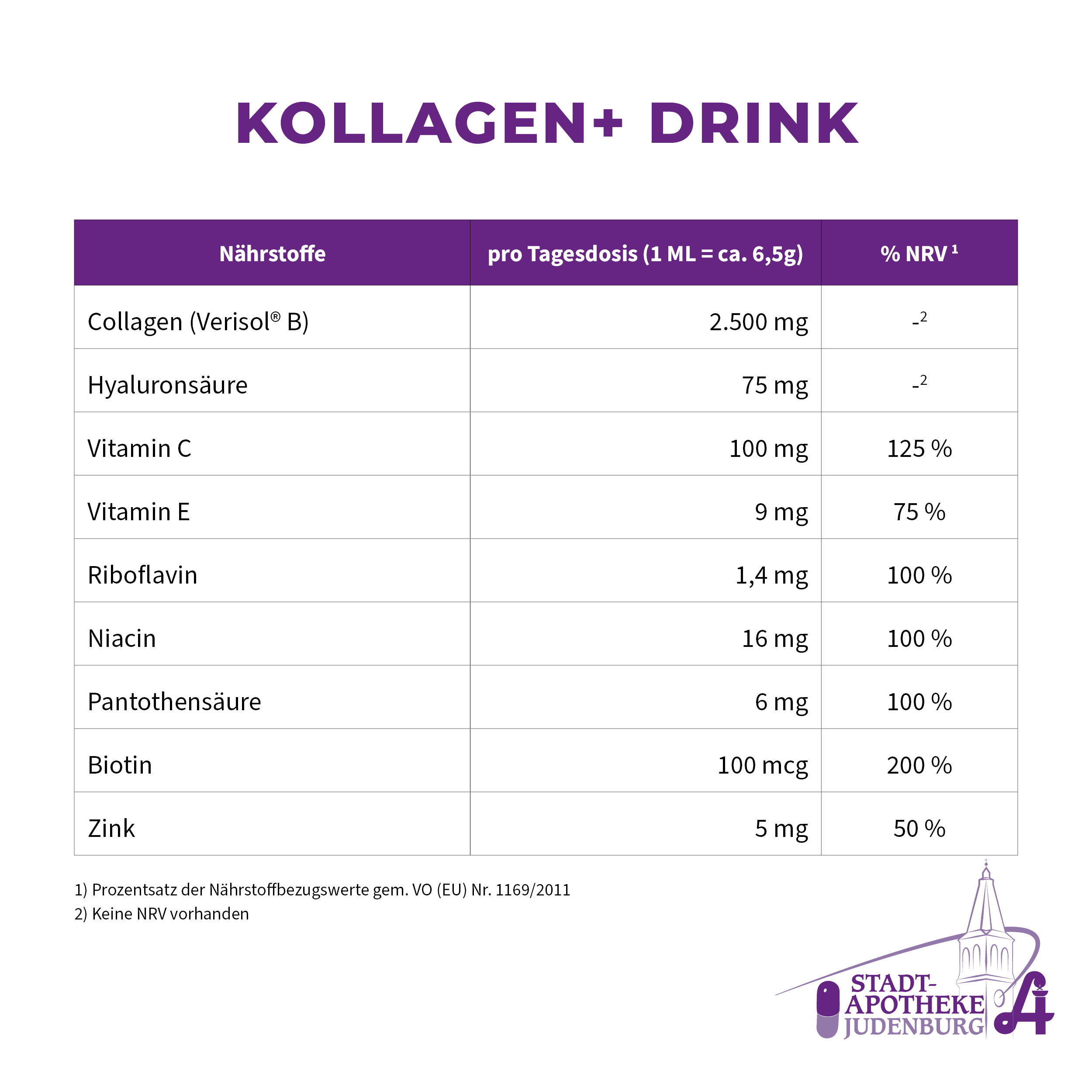 Vitamin C trägt zur normalen Kollagenbildung für eine normale Funktion der Haut bei. Hyaluronsäure kommt natürlicherweise im Körper vor. Zink trägt zur Erhaltung normaler Haut, Haare, Nägel und Knochen bei und unterstützt den Zellschutz vor oxidativem Stress.